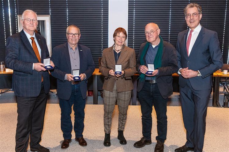 Waterschapsbestuurders Jan van Keulen, Freek Ensink, Rosemarie Merz en Harrie Alberts kregen 27 maart tijdens hun afscheid als lid van het algemeen bestuur van waterschap Vechtstromen de zilveren erepenning uitgereikt door watergraaf Stefan Kuks. De zilveren erepenning is voor leden van het algemeen bestuur die 12 jaar of langer werkzaam zijn geweest bij het waterschap.
