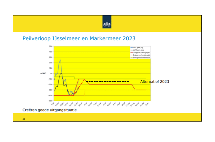 Zodra het voorjaar van start is en het weer wat zonniger wordt, zal het meerpeil van het IJsselmeer en het Markermeer door het gebruik in de omliggende regio’s en verdamping dalen. Daarom kiest Rijkswaterstaat er nu voor om na de voorjaarsopzet tot -0,10 m NAP een vijf centimeter hoger peil aan te houden dan normaal. Dit houdt in dat Rijkswaterstaat 100 miljoen m3 extra zoetwater vasthoudt.