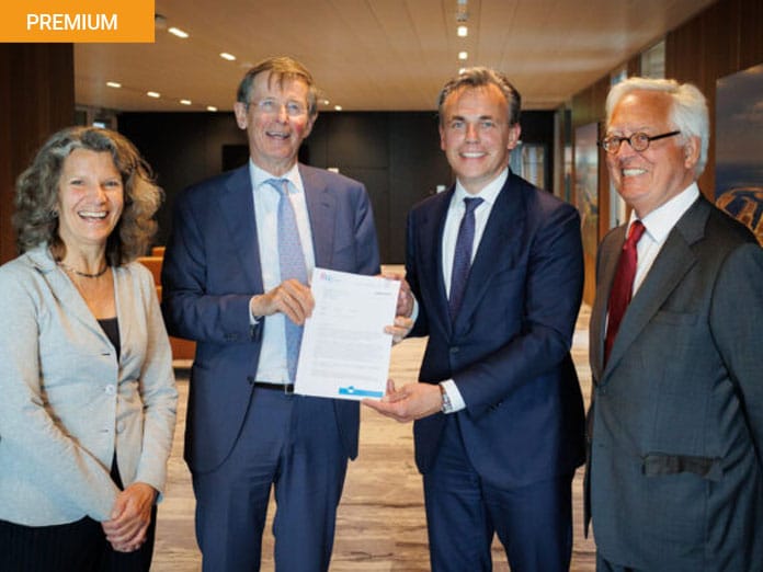 Overhandiging van het Rli advies 'Goed water goed geregeld' op 11 mei: V.l.n.r. Karin Sluis (Rli-raadslid en voorzitter commissie), Jan Jaap de Graeff (voorzitter Rli), minister Harbers en Niels Koeman (Rli-raadslid) (foto: Rli/Fred Ernst).