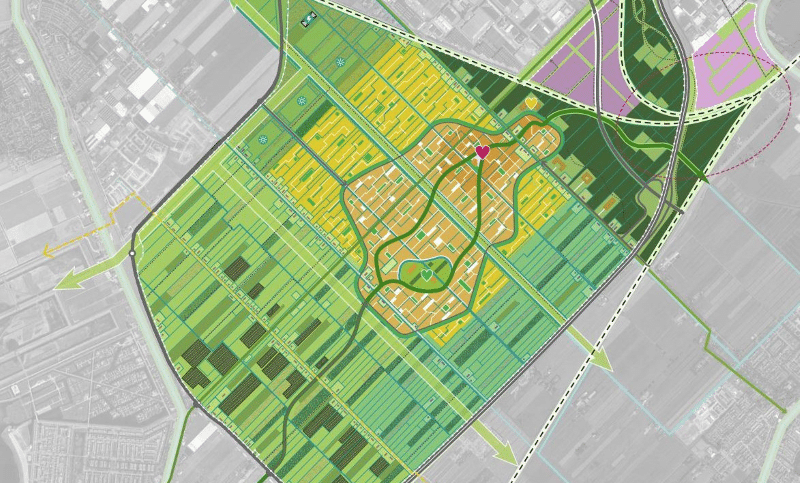 Ontwerp van het geplande vijfde dorp in de Zuidplaspolder met de contouren van de minder zettingsgevoelige voormalige kreekruggen waarop de huizen gebouwd gaan worden. (bron: HHSK)