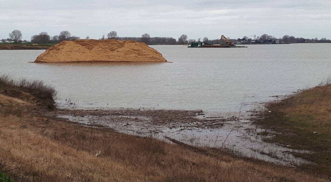 De zandwinput Over de Maas bij Alphen, waar het granietverwerkende bedrijf Bontrup met toestemming van Rijkswaterstaat granuliet heeft gestort. (foto: Jac van Tuijn).