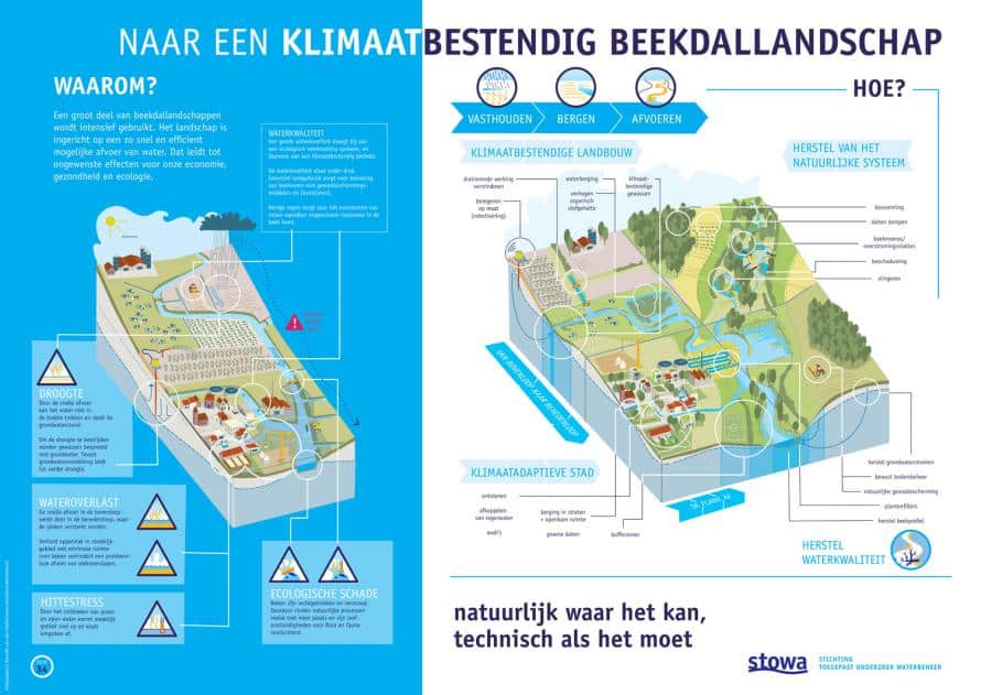 Het klimaatbestendig maken van ons land staat overal op de agenda. Maar hebben we hetzelfde beeld van de inspanning die geleverd moet worden? Samen met de Community of Practice Beken en Rivieren heeft de STOWA een ‘praatplaat’ ontwikkeld om te komen tot Klimaatbestendige beekdallandschappen. Op deze praatplaat is te zien wat de mogelijkheden zijn in het waterbeheer, natuurbeheer, de landbouw en de stad. Aan de hand van deze plaat gaan we met elkaar in gesprek. Doe mee!