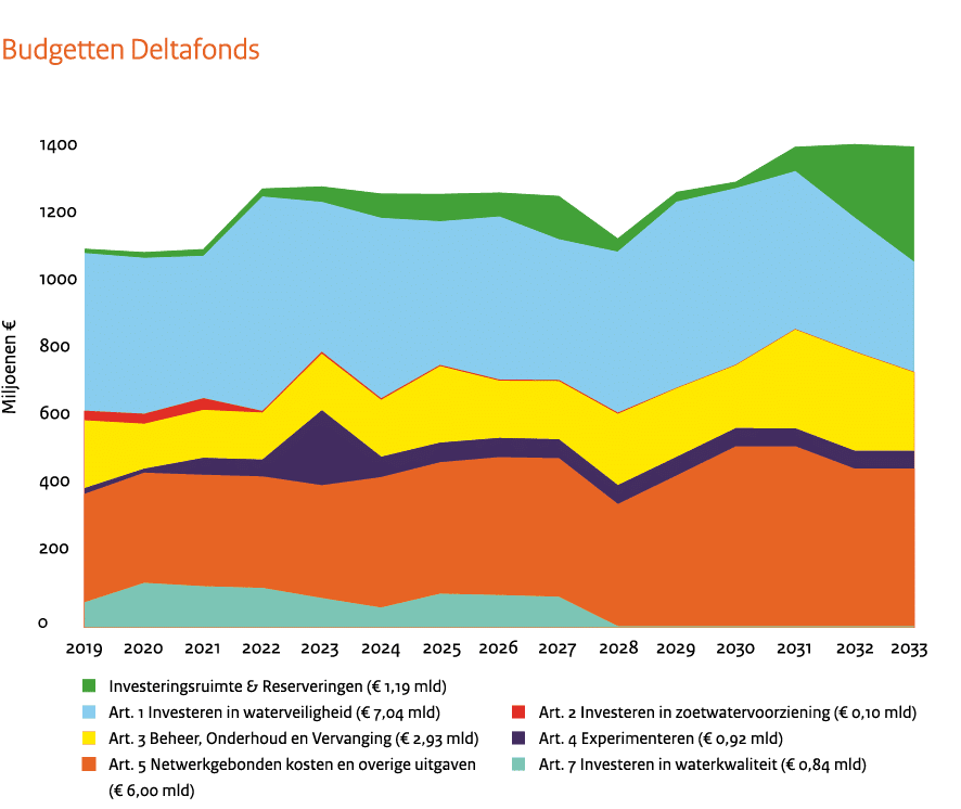 In de periode 2020-2033 is in het Deltafonds circa 17,9 miljard euro beschikbaar, waarmee het jaarlijkse budget gemiddeld op een kleine 1,3 miljard euro uitkomt (in de eerste jaren is dat nog circa 1,1 miljard, maar vanaf 2023 stijgt dat). Bij enkele projecten uit het Deltaplan Waterveiligheid zijn begrotingsaanpassingen verwerkt in de ontwerpbegroting van het Deltafonds 2020. Middelen die zijn vrijgevallen bij Ruimte voor de Rivier, Maaswerken en bij project Varik-Heesselt zijn toegevoegd aan de beschikbare investeringsruimte tot en met 2032. Er zijn ook nieuwe reserveringen opgenomen/verhoogd ten laste van de vrije investeringsruimte tot en met 2032, waaronder 257 miljoen euro voor de Programmatische Aanpak Grote Wateren en 80 miljoen euro voor Integraal Rivier Management. Verder is de uitvoering van het Deltaplan Zoetwater in volle gang. De eerste tranche zoetwatermaatregelen wordt uitgevoerd en voor een tweede tranche van maatregelen is 150 miljoen euro gereserveerd op het Deltafonds.