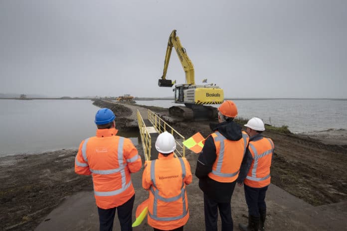 “We koppelen twee watersystemen aan elkaar: het Reevediep en het Drontermeer”, zei Nelly Kalfs in haar speech. “Over een tijdje zie je dat ook op de luchtfoto’s. Door het weghalen van de C-kering zie je de contouren van het nieuwe watersysteem van fase 1.” Gedeputeerde Boerman wees in zijn toespraak op de bijkomende voordelen van deze afgraving: “Er wordt niet alleen een noodzakelijke waterloop aangelegd om hoogwater af te voeren. Nee, we kunnen straks echt gaan genieten van iets moois. Het Reevediep nodigt uit om te gaan wandelen, fietsen en struinen. Of lekker aan de waterkant te zitten vissen. Maar wat ik ook belangrijk vind: we hebben planten en dieren letterlijk de ruimte gegeven in prachtige nieuwe natuur.”