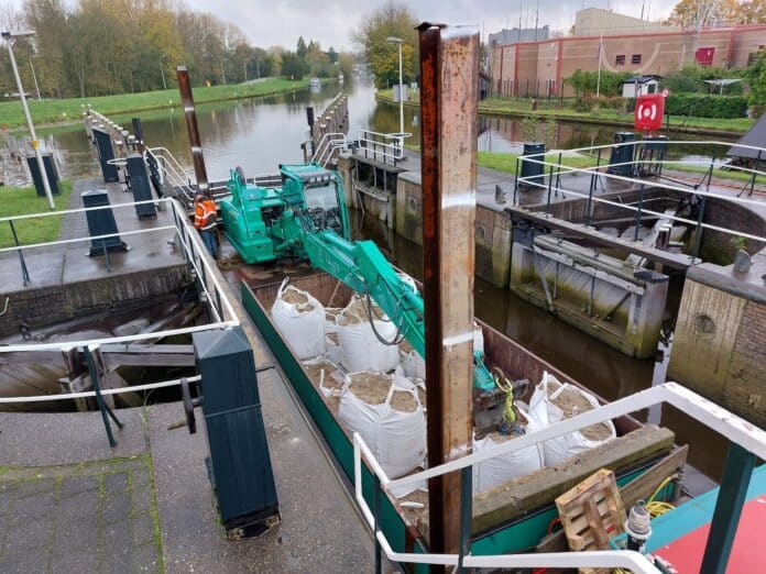 Gouda – Op dit moment worden er 210 ‘big bags’ met zand in de Waaiersluis in Gouda geplaatst. Ten behoeve van de geplande werkzaamheden wordt het waterpeil in de sluiskolk binnenkort verlaagd. De zandzakken zijn nodig om voldoende tegendruk op de bodem te geven, voor als er straks minder water in de sluiskolk staat. Met een hijskraan worden de zakken vanaf een schip in de sluiskolk getild. Een duiker kijkt vanuit het water mee en zorgt ervoor dat de zakken op de juiste plek komen te staan en niet kapotscheuren.