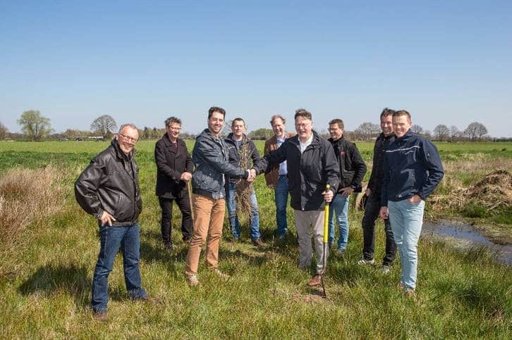 Rudi Antens van Coöperatie Duurzame Energieketen de Baronie en Kees de Jong van waterschap Brabantse Delta planten de eerste boom van het korte omloop bos in de waterberging in Zundert (foto Peter Roek).