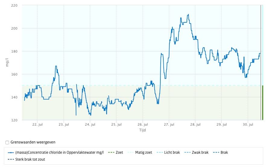 De chloridegehalten in de grote wateren zijn volgens de LCW in het algemeen normaal voor de tijd van het jaar en binnen de norm. Wel zijn in het benedenrivierengebied chloridegehaltes heel licht opgelopen. Om de licht verhoogde waarden in het Volkerak-Zoommeer tegen te gaan, wordt het doorspoelen tijdelijk geïntensiveerd. Meer problemen worden er veroorzaakt door de stijgende temperatuur van het rivierwater, blijkt uit de Droogtemonitor. De watertemperatuur van de Rijn en de Maas is vorige week gestegen tot boven de 23°C en daarna niet of nauwelijks afgenomen. Er zijn diverse waarnemingen van blauwalg en op enkele locaties geldt een negatief zwemadvies. Er is door de hoge temperaturen bovendien een flinke toename van vissterfte gemeld.