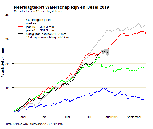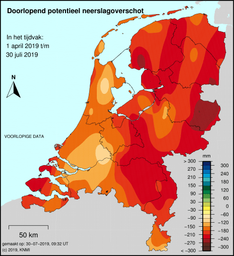 Behalve dat er in de meeste delen van Nederland weinig neerslag viel, zorgden de extreem hoge temperaturen ook voor extra verdamping, waardoor het neerslagtekort vrijwel overal toenam. Met name landbouw en natuur hebben te lijden onder de droogte. Landelijk gezien ligt het neerslagtekort op 176 mm. Dat is meer dan het langjarig gemiddelde voor eind juli (circa 100 mm), maar aanzienlijk minder dan in de recordjaren 2018 en 1976 (circa 250 mm). De komende twee weken wordt volgens de LCW een lichte stijging van het neerslagtekort naar ongeveer 180 mm verwacht. In het oosten en zuiden van Nederland ligt het tekort rond 240 mm en dat blijft naar verwachting de komende twee weken op dat niveau.