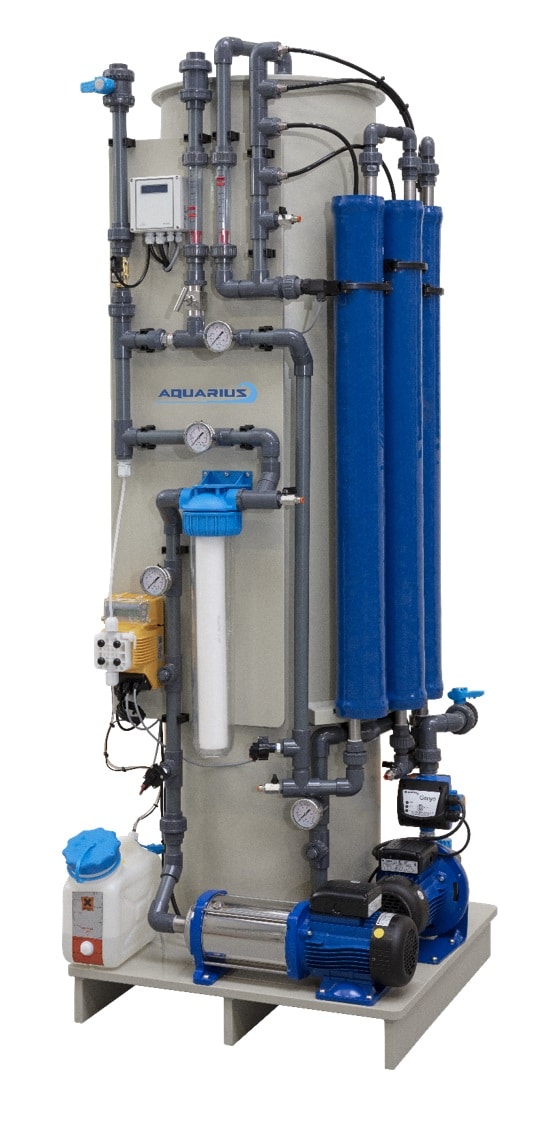 De Aquarius is een compacte RO-unit, met een geïntegreerd opslagvat. De Aquarius kan rechtstreeks op het leidingwaternet worden aangesloten. Dit water wordt vervolgens via een toevoerklep de installatie in getransporteerd, waar het na een veiligheidsvoorfilter op druk wordt gebracht door een Lowara-meertrapspomp. Op deze werkdruk wordt het water door de RO-membranen gezuiverd, waarna het is ontdaan van alle zouten. Het gezuiverde water wordt direct opgeslagen in het geïntegreerde voorraadvat. Optioneel wordt het water vanuit het voorraadvat op druk gebracht met een Lowara hydrofoorpomp.
