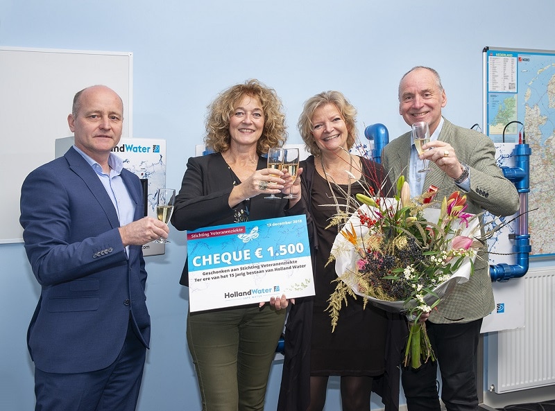 Holland Water bestaat 12 december op de kop af vijftien jaar en viert dat jubileum met het financieel ondersteunen van de Stichting Veteranenziekte. De stichting ontving vandaag een donatie.