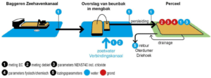 Vervolgens plaatst een kraan het slib in een grondpers om het met zoet water te mengen voor de ontzilting. Daarna gaat het via de grondpers de persleiding in. Op het perceel van ongeveer 4 hectare zijn kades aangebracht, die het slib op het perceel houden. Daar krijgt het drie tot vijf jaar de tijd om te drogen en rijpen tot vruchtbare grond. De grondeigenaar wil er pootaardappelen gaan verbouwen.