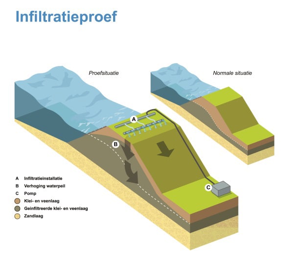 In eerste instantie wordt gestart met interval-infiltratie om zicht te krijgen op na-ijlende effecten. De tweede dag zal er gedurende zo’n tien uur water over het binnentalud van de dijk lopen. Hierdoor wordt de waterdruk in de dijk op een gecontroleerde manier opgevoerd. De druk in de dijk wordt continu gemeten om de stabiliteit van de dijk in de gaten te houden. Een oppervlakkige afschuiving van het talud van de dijk kan een gevolg zijn van deze proef, maar de veiligheid komt niet in het geding, zo meldt het Hoogwaterbeschermingsprogramma (HWBP).