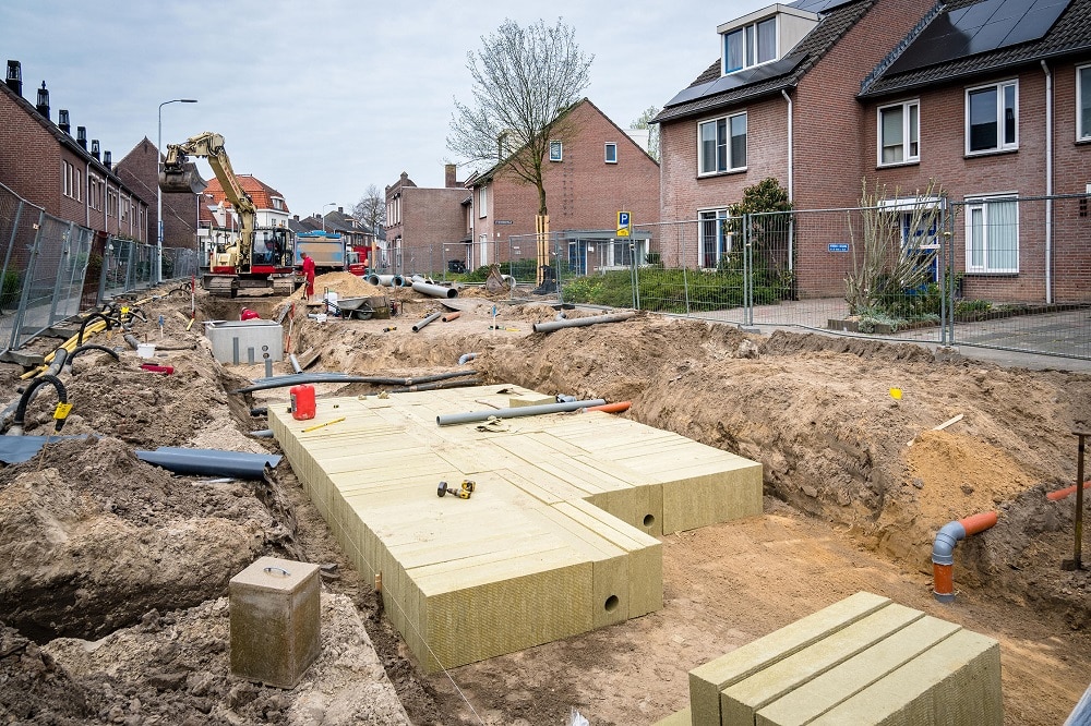 In de Eindhovense wijk Strijp wordt op dit moment de Hastelweg klimaatbestendig en waterrobuust gemaakt. Om in de toekomst in de stad beter voorbereid te zijn op extremere buien voert Eindhoven een aantal projecten uit waarbij het oude rioleringsstelsel wordt omgevormd naar een gescheiden stelsel met een vuilwaterriool en een hemelwaterriool. Tegelijkertijd wordt in deze straat een waterberging gerealiseerd die tot 60 mm regenwater kan bergen bij piekbelasting. Bij het project in Strijp heeft Eindhoven nadrukkelijk voor Rockflow (onderdeel ROCKWOOL Group) gekozen om dit steenwol waterbuffersysteem te kunnen vergelijken met al andere reeds toegepaste ondergrondse oplossingen voor waterberging in de stad. Op die manier is proefondervindelijk vast te stellen welke oplossing voor welke situatie het meest geschikt is voor toekomstige projecten. “Bij dit project is bijvoorbeeld de ruimte voor maatregelen beperkt vanwege het hoge grondwaterpeil en smalle wegprofiel. Steenwol is dan geschikt omdat het naar verhouding compact en flexibel is”, zegt Frank van Ekert van de gemeente Eindhoven.