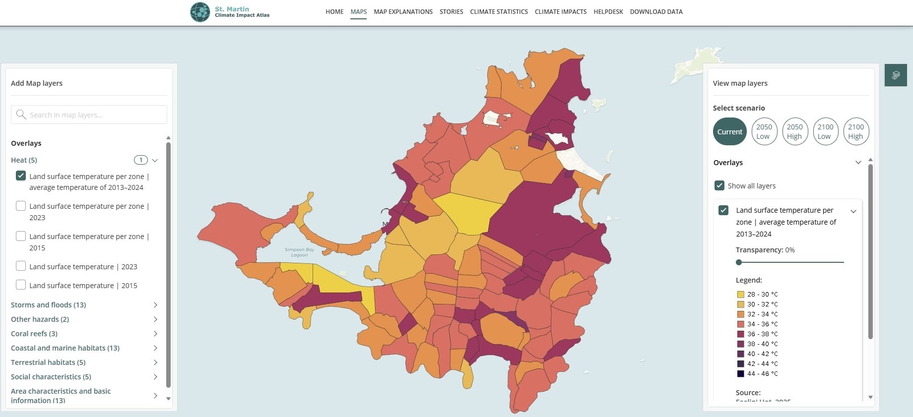 Kaartuitleg: De belangrijkste kaarten uit de viewer hebben een kaartuitleg. De kaartuitleg geeft informatie over onderwerpen zoals koraalriffen, mangroves, orkaanroutes uit het verleden, toekomstige kustlijnen en de biodiversiteit op het land.