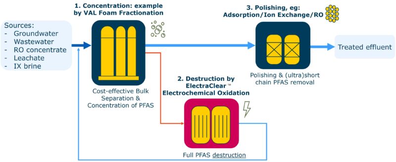 Vervolgens breekt elektrochemische oxidatie (EOx) de geconcentreerde PFAS-moleculen af. Deze destructiestap draait op het electraCLEAR-platform van het Canadese Axine Water Technologies, dat sinds 2017 commercieel wordt toegepast.