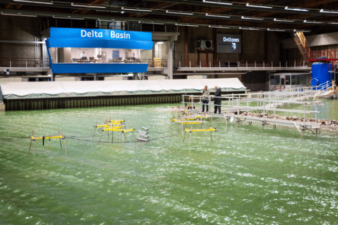 Naast de testen in de Delta Basin worden er ook metingen uitgevoerd in de Deltagoot voor optimalisatie van vleugelbladen van het Slow Mill apparaat. In een schaalmodel van 1:8 testen we het vermogen van de golven dat dat wordt afgegeven aan de Slow Mill. Op basis hiervan kan het profiel van de vleugelbladen worden geoptimaliseerd.