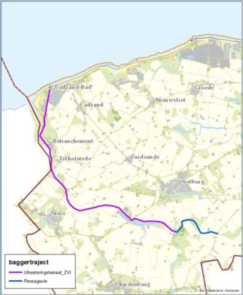 Waterschap Scheldestromen is gestart met voorbereidende werkzaamheden voor het baggeren van het Uitwateringskanaal en de Passageule vanaf Cadzand tot vlakbij Waterlandkerkje. De grote schoonmaakbeurt van het kanaal en de kreek, over een lengte van 18 kilometer, moet de waterafvoer verbeteren. De voorbereidingen bestaan uit een onderzoek naar niet gesprongen explosieven en het snoeien van beplanting.