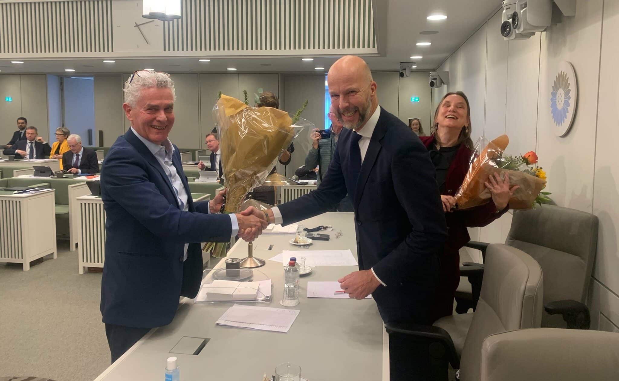 D66-senator Henk Pijlman (links) feliciteert zijn partijgenoot Tjeerd de Groot en GroenLinks-Kamerlid Laura Bromet met het door beide Kamers loodsen van hun initiatiefwet (foto: D66).