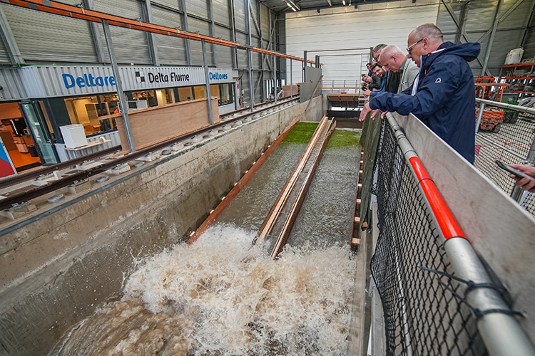 Projectmanager Erik Jolink van waterschap Hunze en Aa’s legt in het nieuwsitem uit hoe het slib tot klei wordt gemaakt. Hij laat ook zien dat de klei voldoende stevigheid heeft om te worden gebruikt voor het versterken van dijken. In een nieuwsbericht van het waterschap geeft hij een toelichting op de proeven in de Deltagoot. ‘In de eerste proevenserie hebben we de sterkte van twee soorten klei getest: klei uit de zogenoemde kleirijperij, waarin we lokaal gewonnen slib laten drogen tot klei en klei gegraven op de kwelder. De proefdijk van deze beide kleisoorten hield zich goed. De norm is dat de klei vijftien uur een superstorm moet kunnen weerstaan, maar na 22 uur hield de dijk nog steeds stand. In deze tweede proef testen we het ontwerp van de dijk met een graslaag. De gegevens uit beide proeven combineren we om het ontwerp te kunnen optimaliseren’