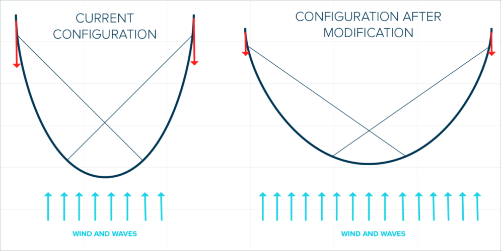 Om de U wijder te maken, gaat het team de kabels die het systeem de U-vorm geven, iets losser maken. Dat doet het team stapsgewijs, in de hoop uiteindelijk de ideale breedte te vinden en het gewenste effect te bereiken. Omdat een verbreding van de opening naar verwachting een negatief effect zal hebben op het vermogen van het systeem om snel te draaien wanneer er een verandering in de windrichting optreedt, moet het team van The Ocean Cleanup erop letten dat de overspanning niet te veel wordt verhoogd.