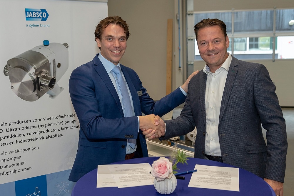 Tijdens de officiële opening van het pand van Van der Ende Groep afgelopen zaterdag, was de stand van Jabsco dan ook vertegenwoordigd en is het contract officieel getekend door Lex van der Ende (Algemeen Directeur Van der Ende Groep) en Ruud Vreeburg (Sales Director Specialty Flow Control EMEA, Xylem).
