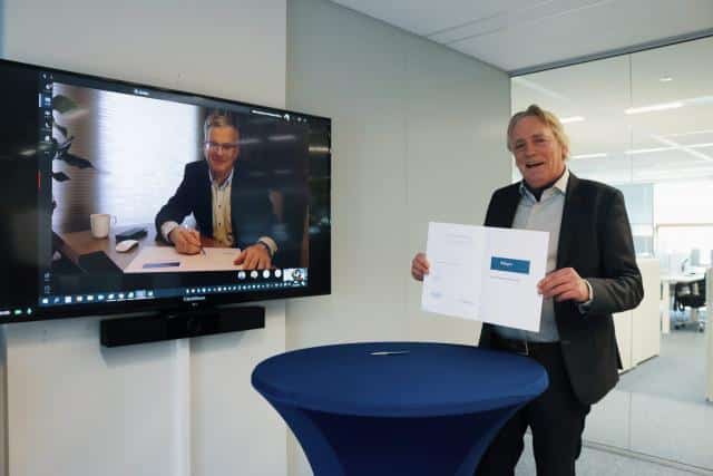 Gedeputeerde Gert Harm ten Bolscher van de provincie en Dagelijks-bestuurslid Hans Pereboom van WDODelta ondertekenen de samenwerkingsovereenkomst (foto: WDO Delta).