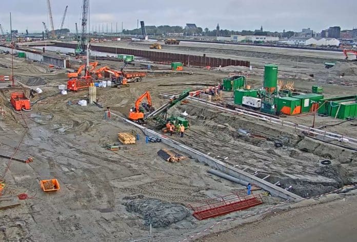 De werkzaamheden aan de nieuwe sluis moeten in 2022 zijn afgerond. (beeld: webcam).