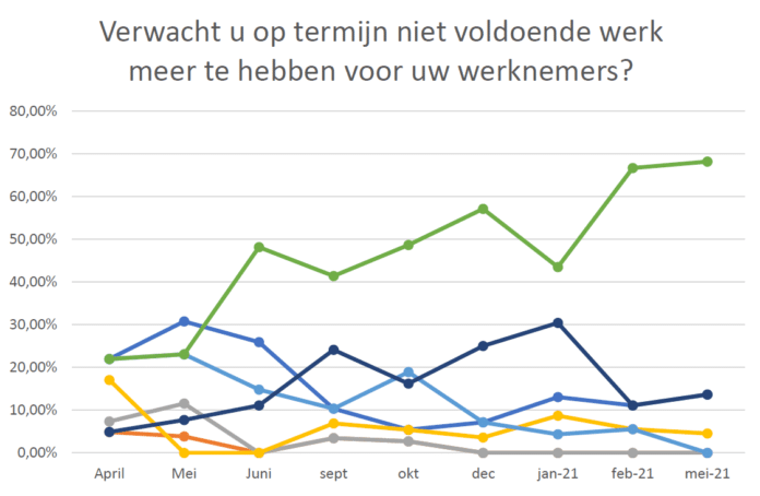 Hoewel de signalen in deze enquête ook terug te zien zijn in de maatschappelijke ontwikkeling, blijft het afwachten hoe de markt zich zal ontwikkelen en hoelang de steunmaatregelen van kracht blijven. 20 procent van deelnemende bedrijven heeft in mei gebruik gemaakt van de NOW- of TOZO-regeling, dit is iets meer dan in januari, toen nog 16 procent hier gebruik van maakte.