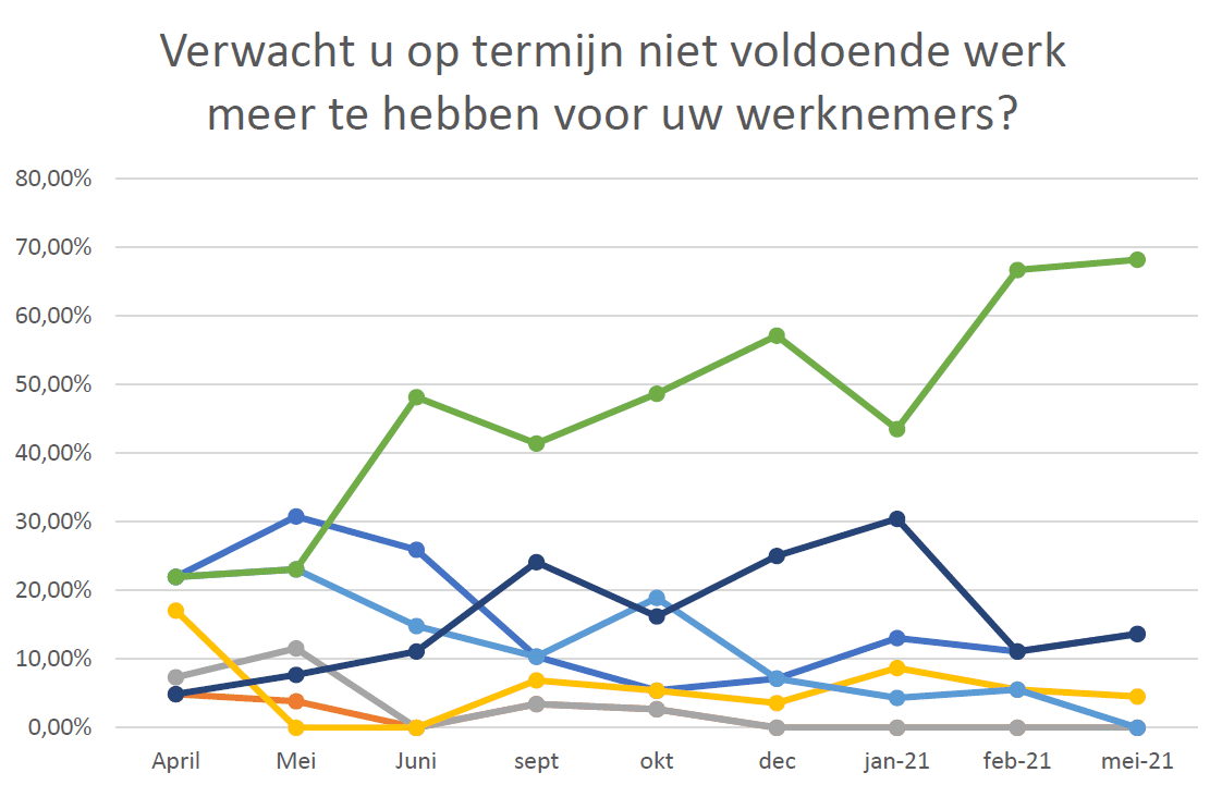 Vooral bij de grotere percentages omzetverlies is een stijging zichtbaar. Het aantal respondenten dat 80 procent of meer omzetverlies verwacht is gestegen van 4 procent in januari, naar 9 procent in mei. Ook voor het aantal respondenten dat een omzetverlies verwacht van 40-60 procent, geldt een stijging van 4 naar 9 procent. De sterkste stijging is te zien in het aantal respondenten dat 10-20 procent omzetverlies verwacht. In januari was dit nog 4 procent, in mei is dit gestegen naar ruim 22 procent.