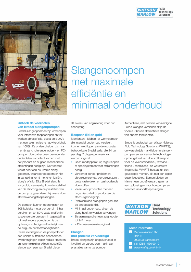Bredel is onderdeel van Watson-Marlow Fluid Technology Solutions (WMFTS), de wereldwide marktleider in slangenpompen en aanverwante technologie op het gebied van vloeistoftransport voor de levensmiddelen-, farmaceutische-, chemische- en waterzuiveringsmarkt. WMFTS bestaat uit tien gevestigde merken, elk met een eigen expertisegebied. Samen bieden ze klanten een ongeëvenaard gamma aan oplossingen voor hun pomp- en vloeistoftransporttoepassingen.
