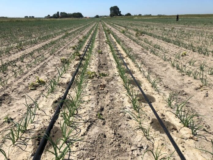 Het project Deltadrip startte in het najaar van 2018 op een proefperceel van 1 hectare op een akkerbouwbedrijf in Philippine. Vorig jaar stonden er pootaardappelen en nu uien. Er liggen zowel boven- als ondergrondse leidingen die via een computersysteem de uien bedruppelen wanneer dat nodig is. Op het aanliggende perceel gebruikt de agrariër de traditionele spuithaspelberegening. “Dat hebben we bewust gedaan om de resultaten van beide technieken goed met elkaar te kunnen vergelijken”, zegt Simon Meijeren, projectleider van het Deltadrip-project en tevens agro-hydroloog.